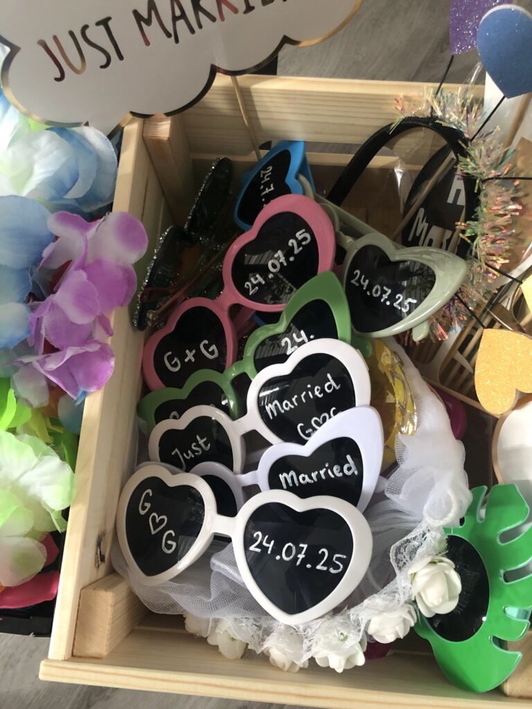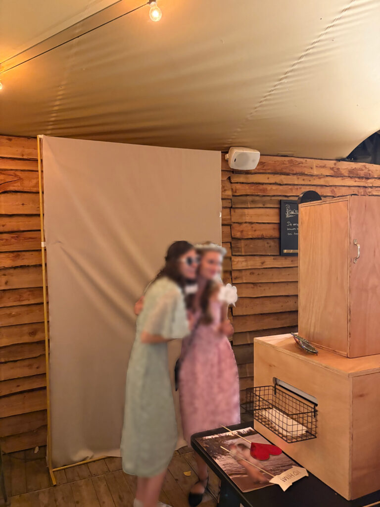 Op deze bruiloft creëerden we een rustige achtergrond met een frame met beige doek. Dit zorgde voor een egale en rustige achtergrond op de foto’s. We hadden veel kleurrijke props mee, bijvoorbeeld zonnebrillen met daarop de initialen en trouwdatum van het bruidspaar, geschreven met witte stift.